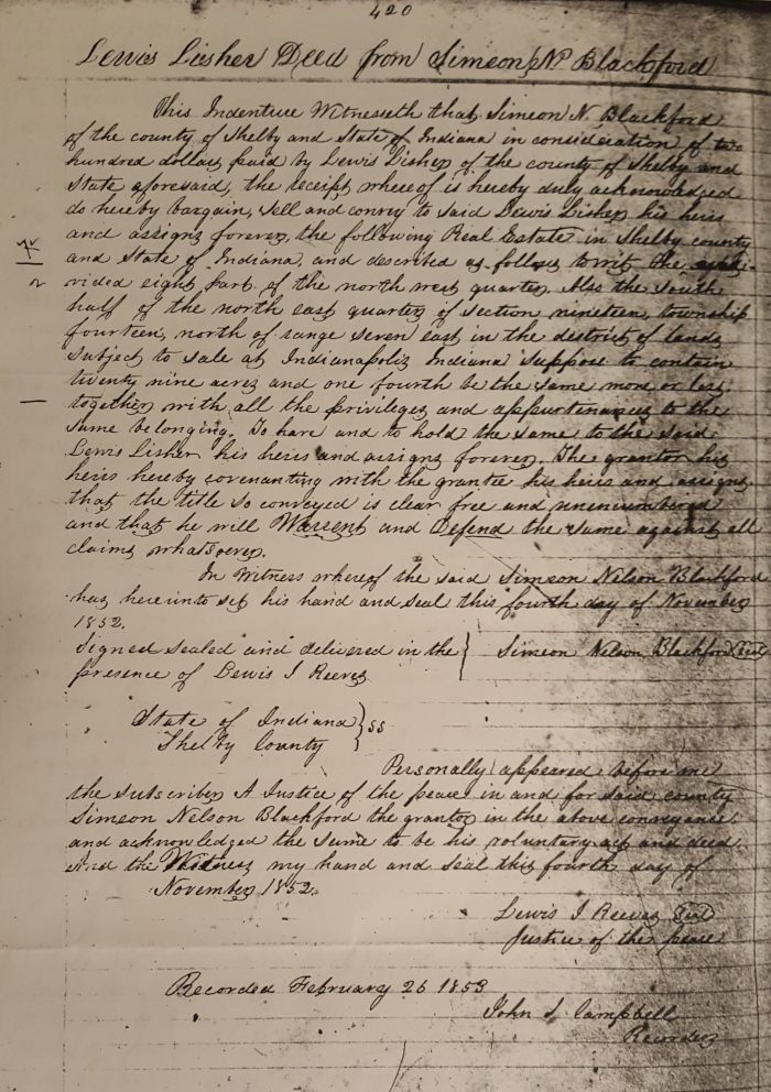 Shelby County, Indiana Land Records Lewis Lisher from Simeon N. Blackford November 1852 The undivided eighth part of the (1) nw/4 and (2) s/2 of ne/4 of Section 19 of Township 14-North of Range 7-East. Contributed by Phyllis Miller Fleming Land Records Index Main Page To contact the researcher listed above, use the Surname Index.