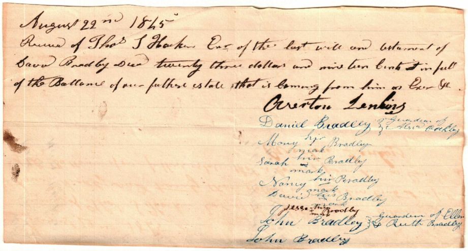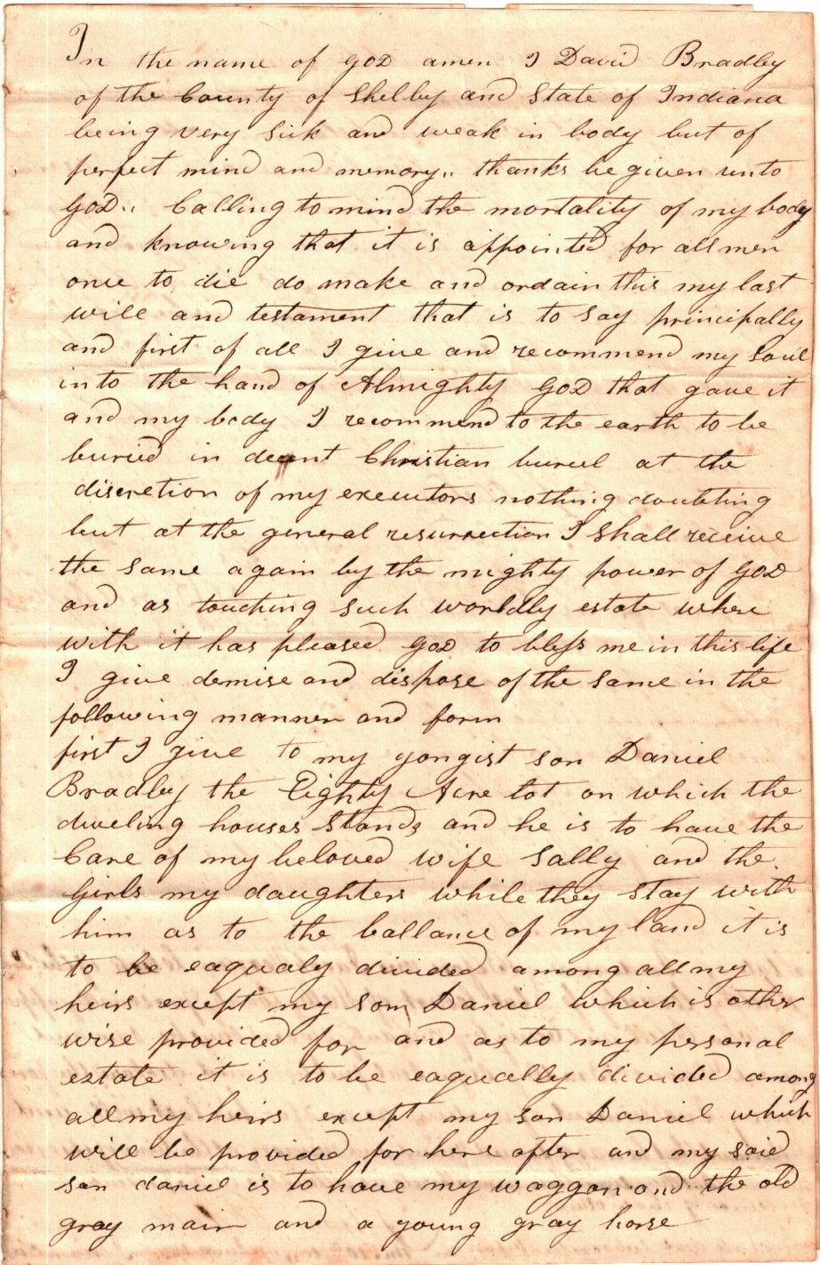 Shelby County, Indiana Courthouse Records Will of David Bradley Box 13 David Bradley, dec'd Thomas S. Hacker, executor 1845 Contributed by Phyllis Miller Fleming Will Index Main Page To contact researchers listed above, use the Surname Index