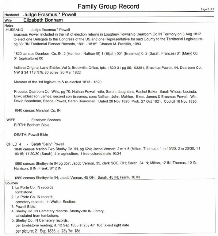 Shelby County Indiana Family Records Powell Erasmus, 1788 - 1843 First wife, Elizabeth Bonham 1785 - 1815 Additional Powell Family Group Sheets Homepages Index Main Page To contact the researcher listed above, use the Surname Index